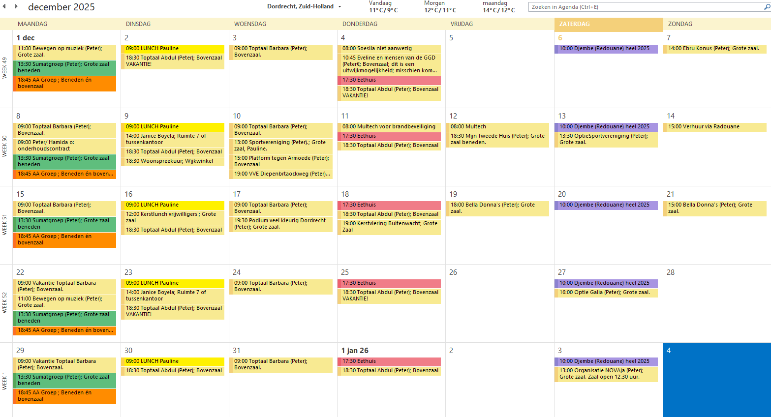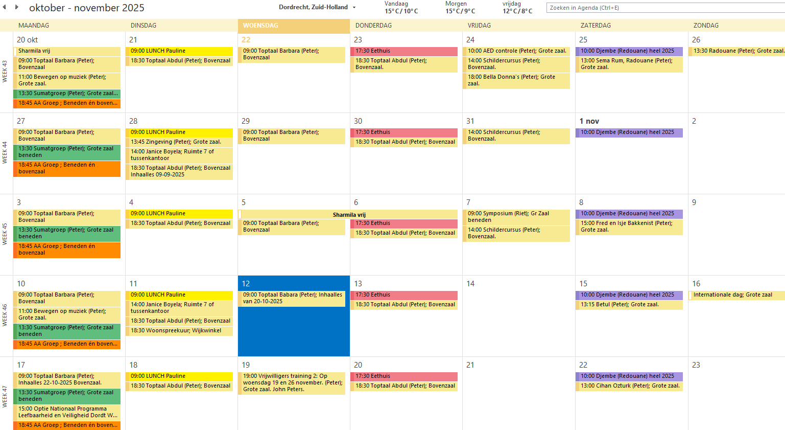 De kalender voor klanten om afspraken in te plannen is nog in bewerking. In de tussentijd wordt een momentopname gedeeld van de bestaande outlook agenda. Veranderingen na deze opname zijn dus nog niet verwerkt in onderstaande overzicht. De opnamedag betreft: