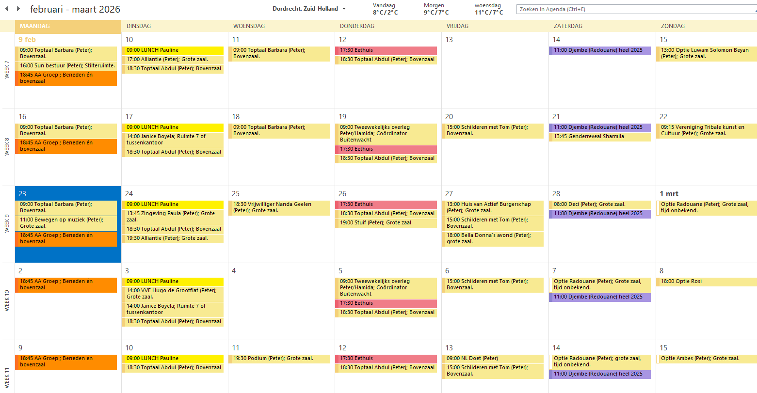 De kalender voor klanten om afspraken in te plannen is nog in bewerking. In de tussentijd wordt een momentopname gedeeld van de bestaande outlook agenda. Veranderingen na deze opname zijn dus nog niet verwerkt in onderstaande overzicht. De opnamedag betreft: